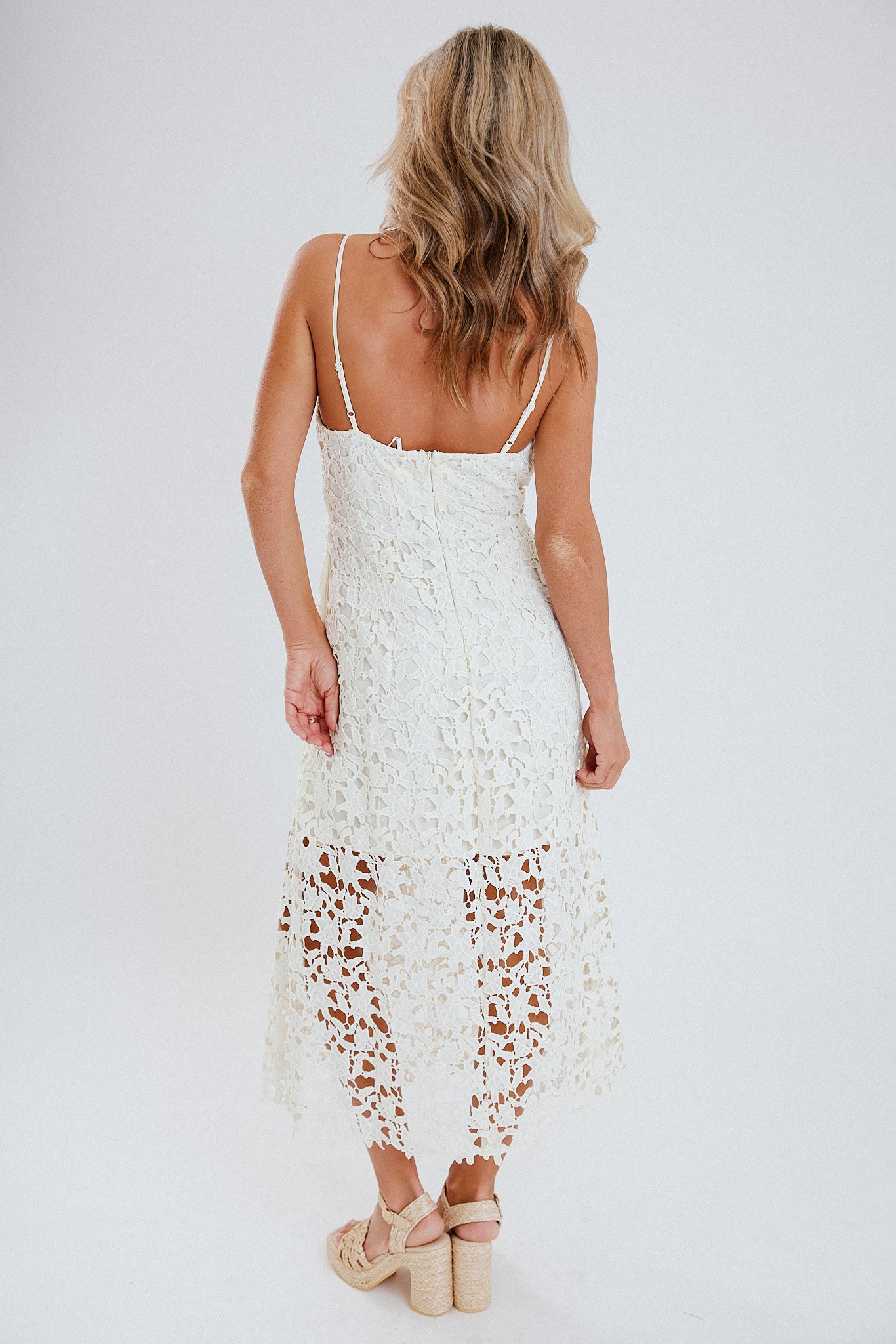 Step out in style with the Emaline Midi Dress in Cream! This fun and flirty lace cami dress features adjustable straps for the perfect fit and a zipper closure.
