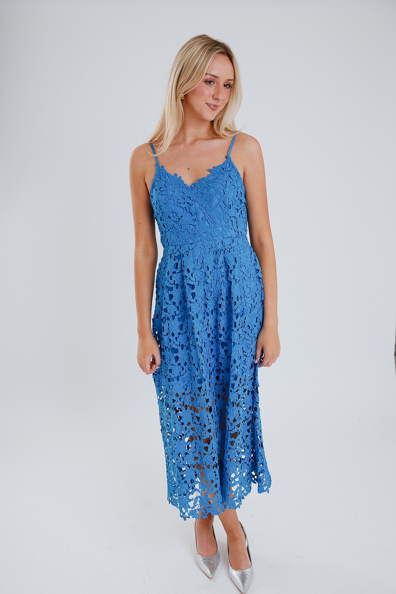 Step out in style with the Emaline Midi Dress in Ocean Blue! This fun and flirty lace cami dress features adjustable straps for the perfect fit and a zipper closure.