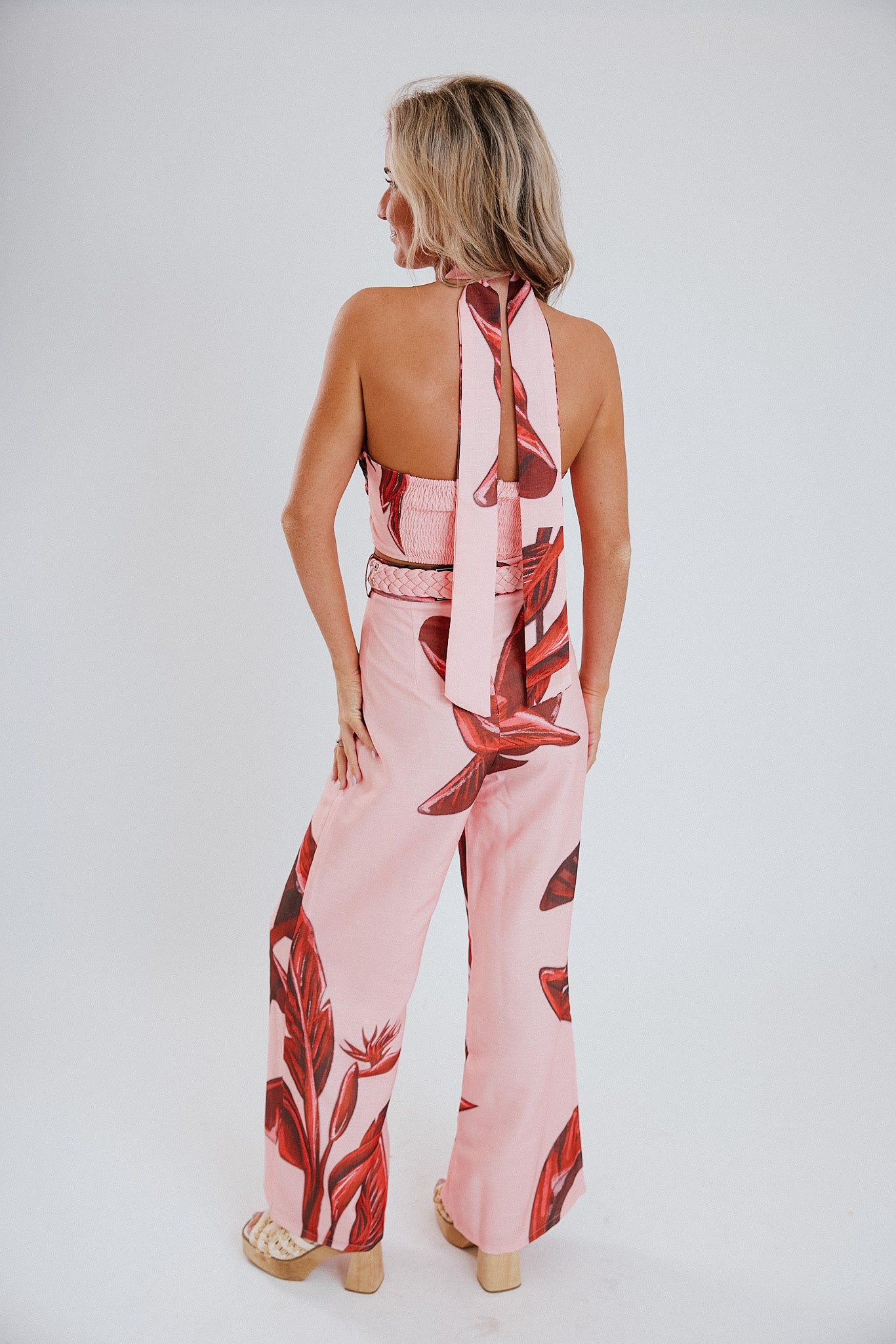 Transport yourself to paradise with our Tropical Island Set! This playful set features a vibrant tropical print, complete with a comfortable halter top and flowy wide leg pants.
