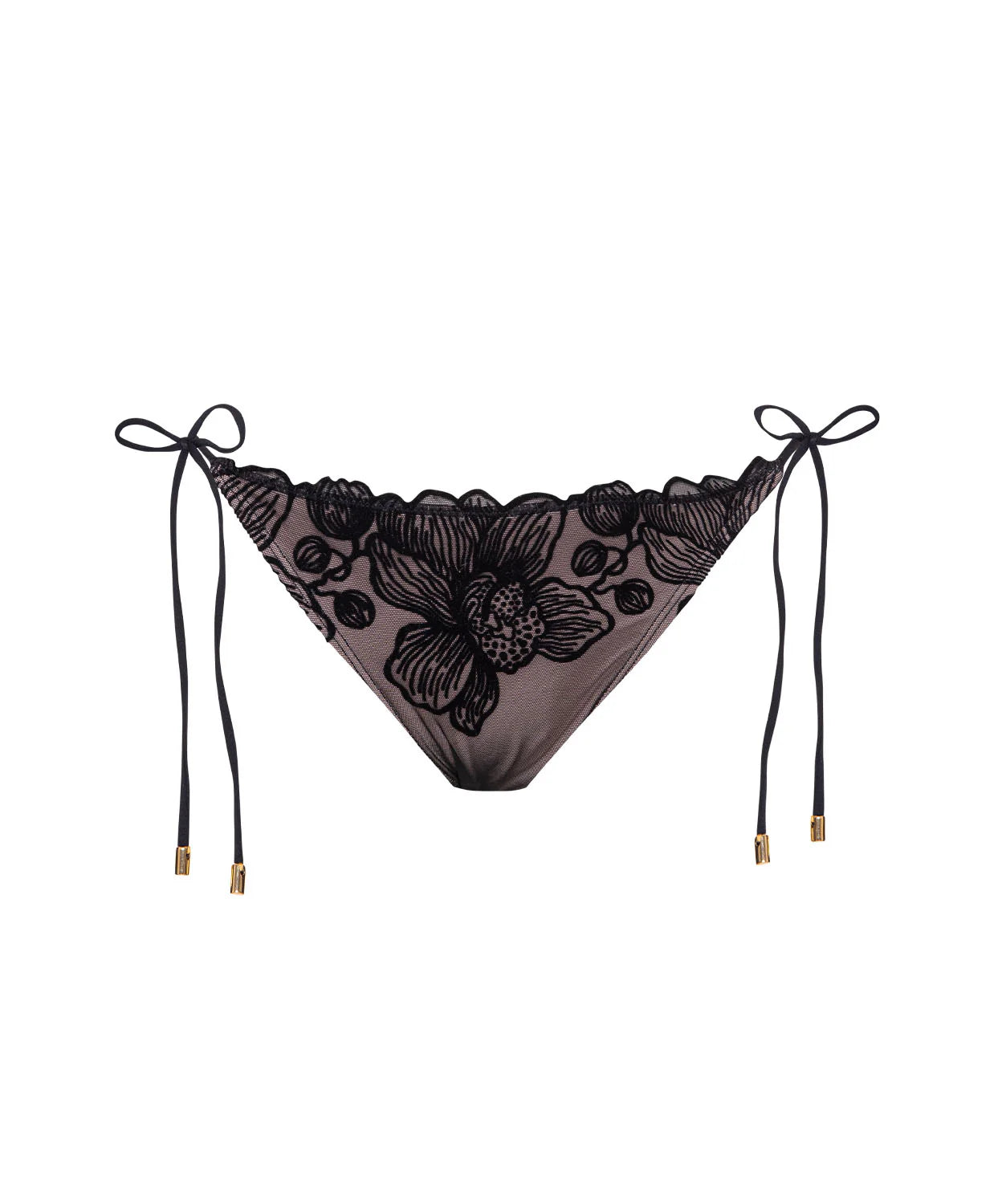 The Eclipse Tie Side Bottom is crafted from sheer black mesh with soft velvet floral accents, offering a bold yet elegant look. Adjustable ties at the hips offer a personalized fit, while delicate ruching in the back enhances and flatters. Pair it with the Eclipse Triangle Top for a sleek, statement-making set.