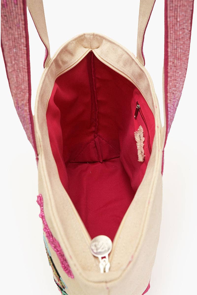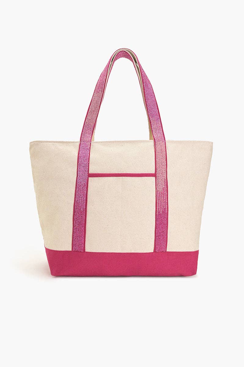 This oversized tote is your new beachside bestie, with stunning sea-inspired embellishments that give it a truly unique charm. Crafted from durable, natural canvas, it’s built to handle all your essentials with style. The pink beaded shoulder handle adds a pop of fun, while the top zipper keeps everything secure. Inside, you’ll find a handy zipper pocket, and a back slip pocket for easy access to your phone or keys.