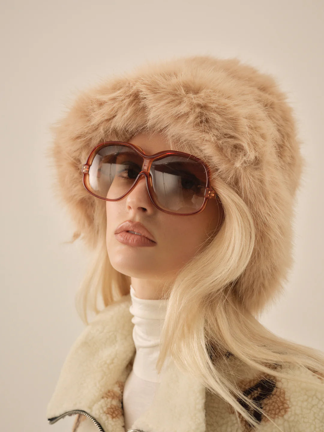 Inspired by a ‘70s Swiss Alps aesthetic, this white faux fur bucket hat blends Old Hollywood decadence with iconic slope dressing. Crafted entirely from plush faux fur, this cold weather bucket hat is extra cozy and adds a feminine, playful finish to any winter look.