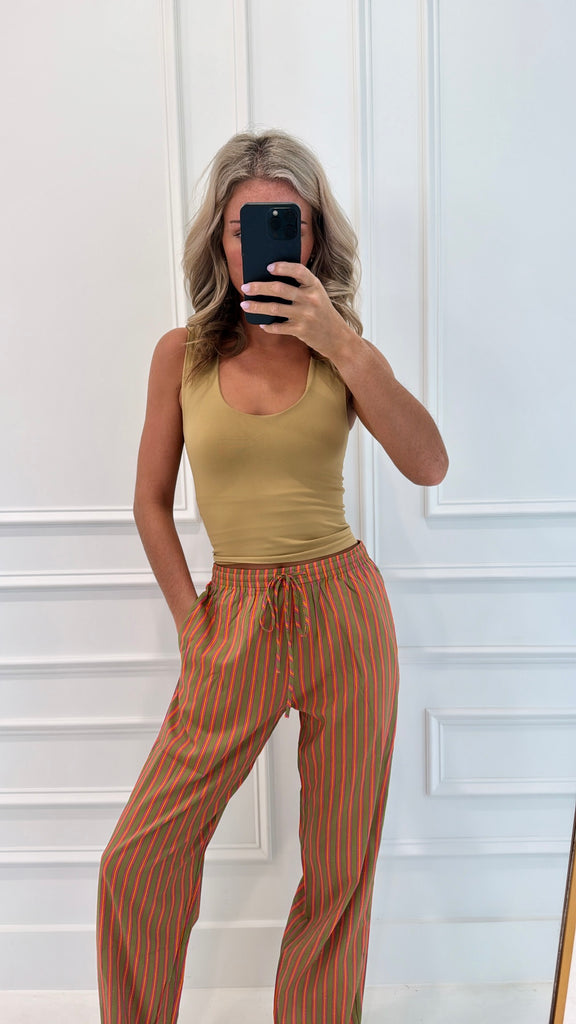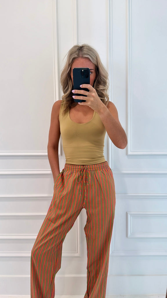 Get ready to make a statement in our Missy Striped Pants that feature a fun multicolor stripe pattern! It has a green, magenta and orange striping.