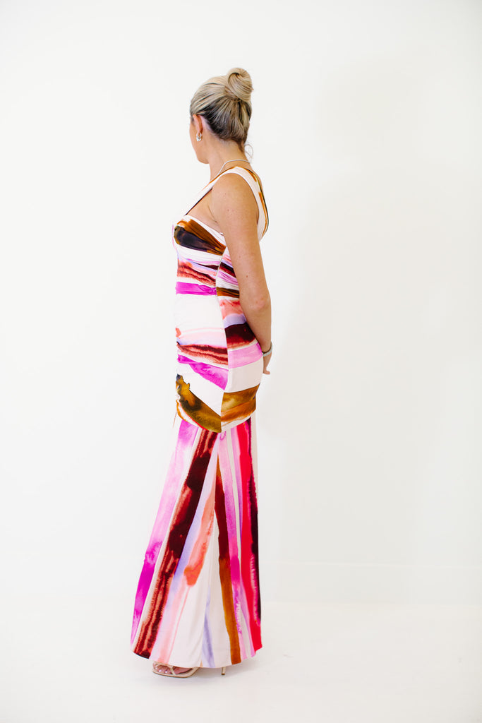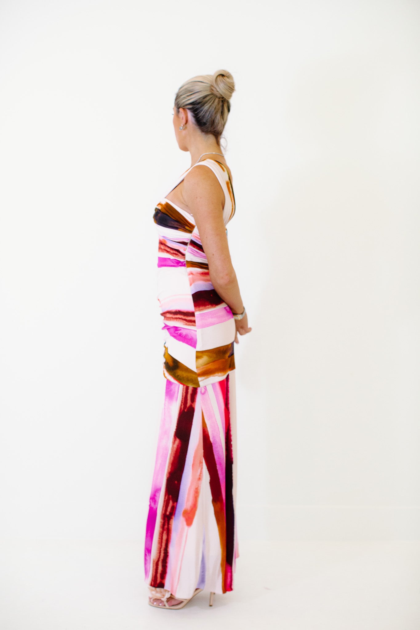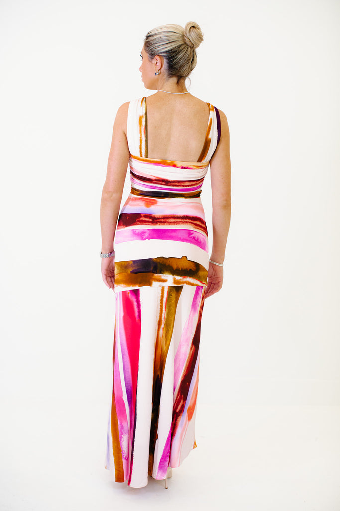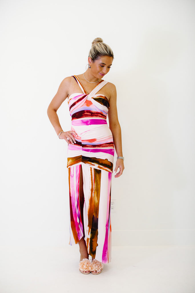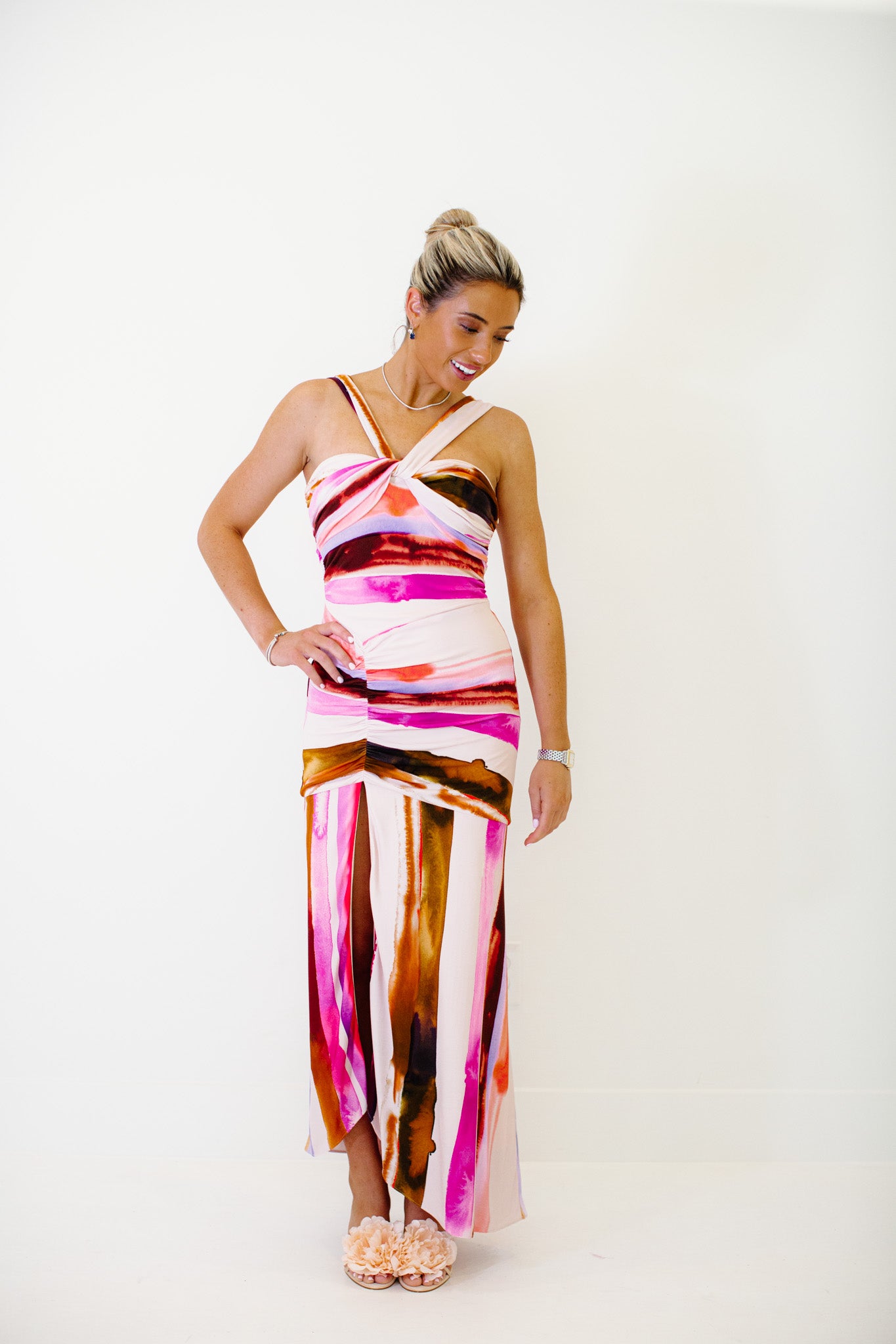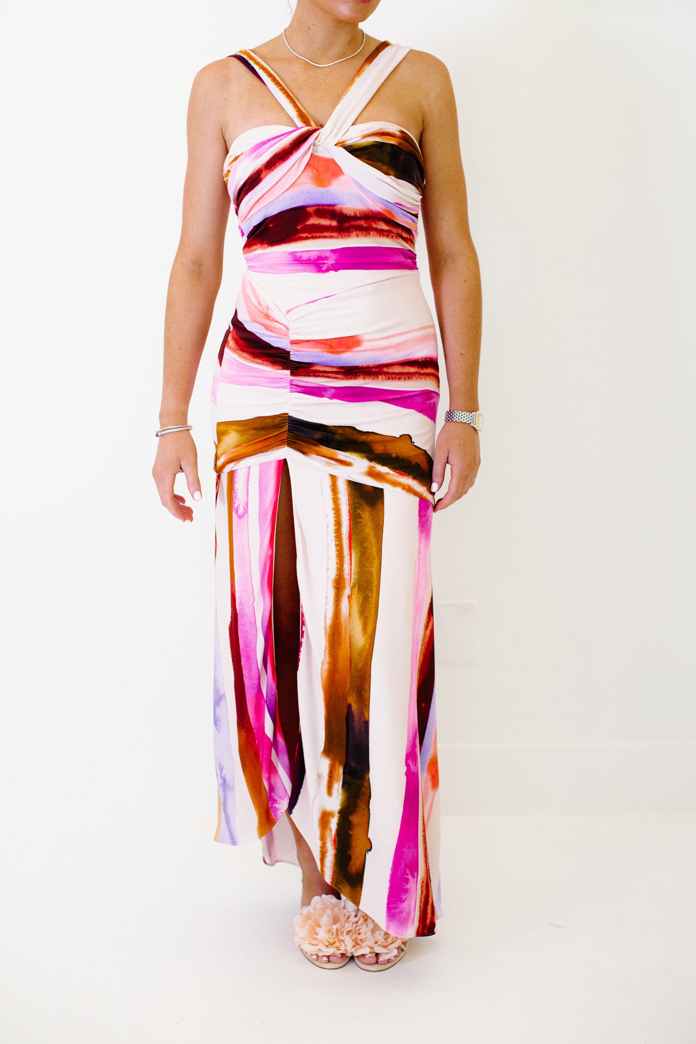 Crafted from matte jersey, the Casi Dress contours the body with a twisted bust panel and sculptural halter straps. Asymmetrical gathering at the leg flows into a soft mermaid silhouette, while a thigh-high slit adds movement and allure.