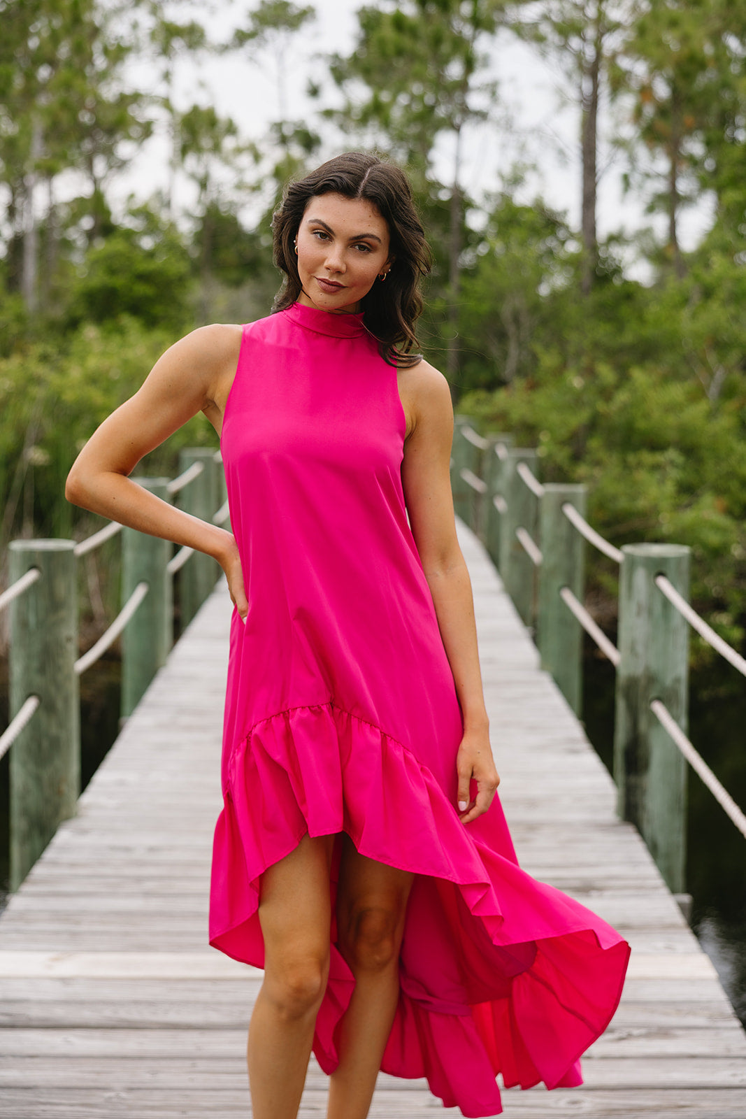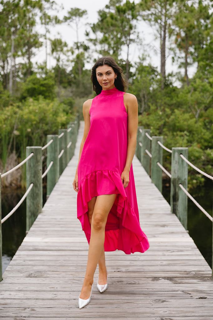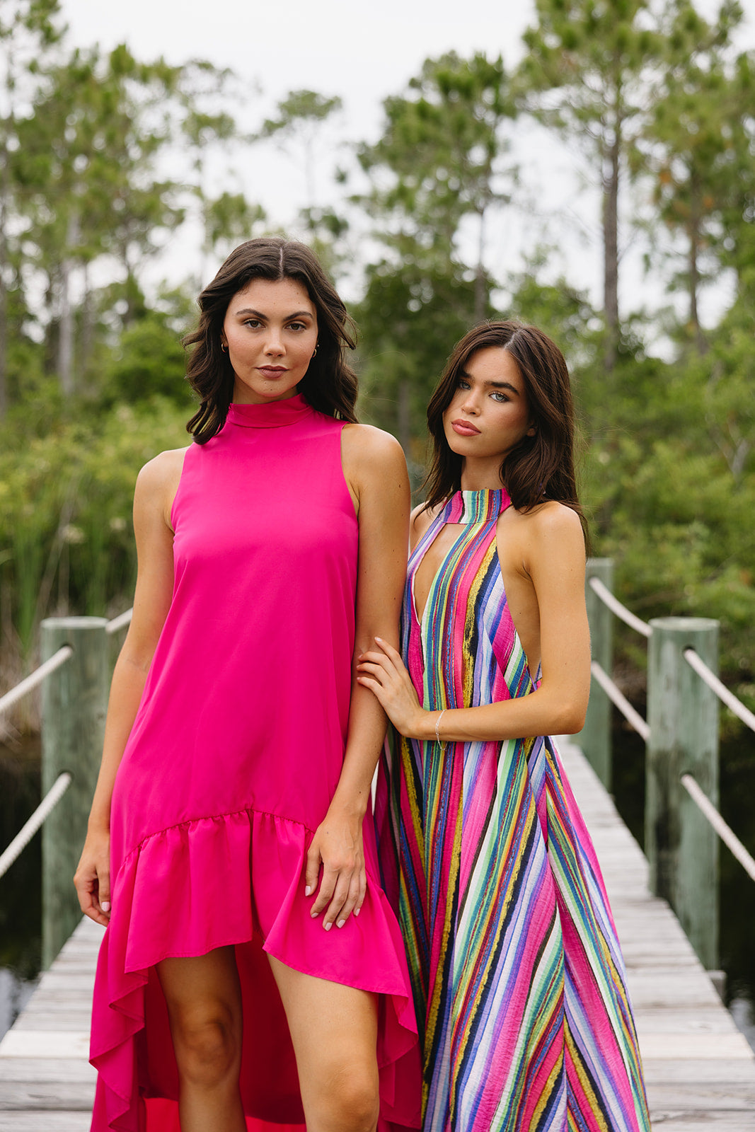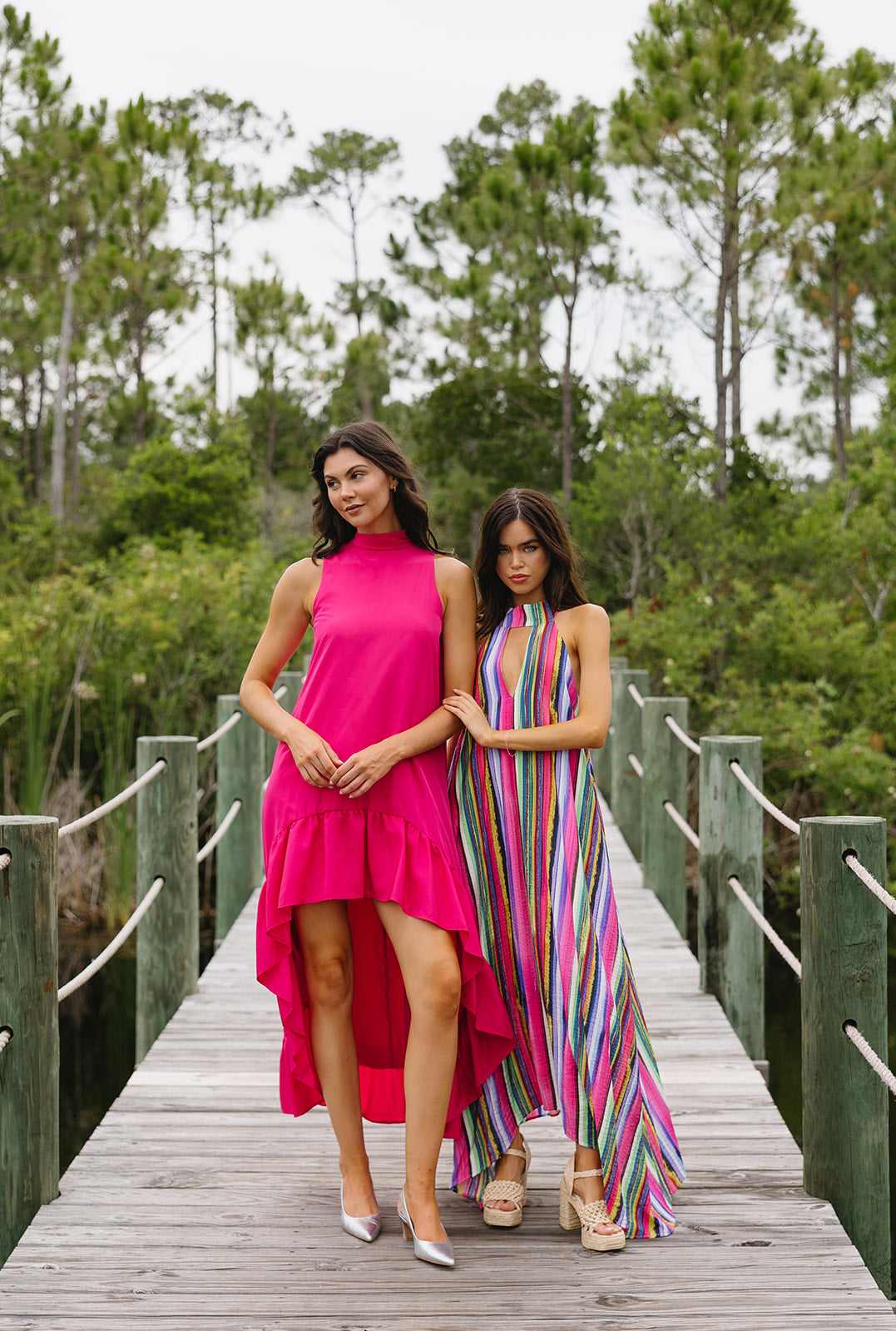The Yolanda brings vibrant style and playfulness to any occasion. This hi-low taffeta maxi dress, featuring a high halter neck, flowing neck-ties, and a ruffled hem, is downright chic and flirty.