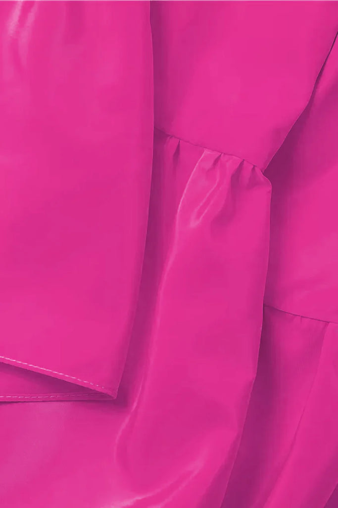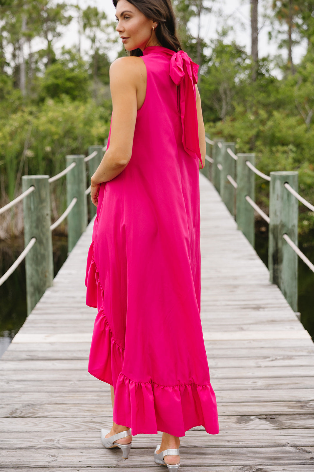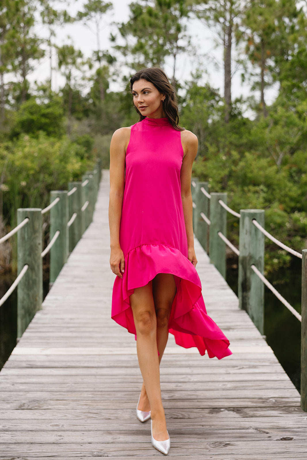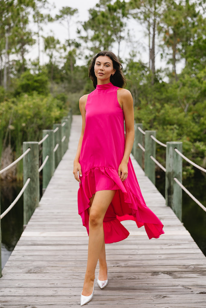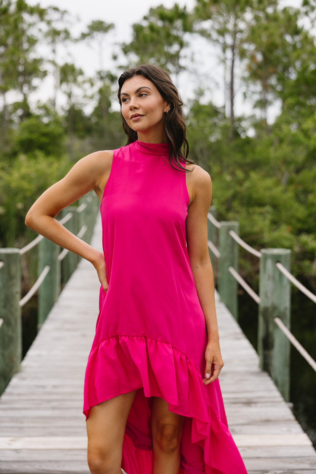 The Yolanda brings vibrant style and playfulness to any occasion. This hi-low taffeta maxi dress, featuring a high halter neck, flowing neck-ties, and a ruffled hem, is downright chic and flirty.