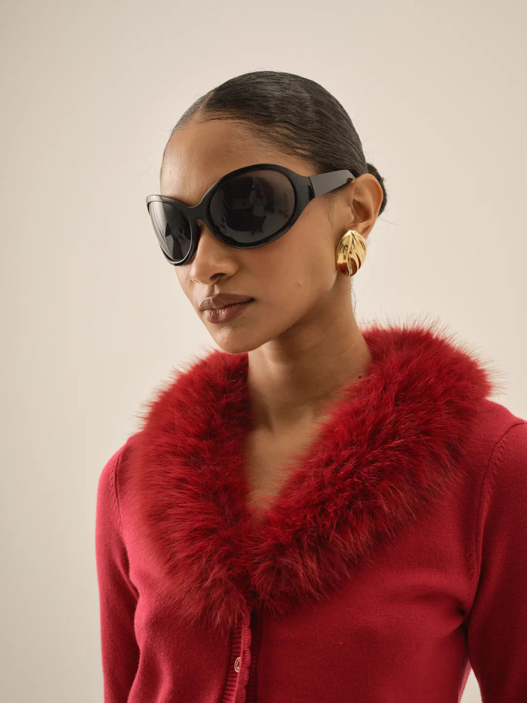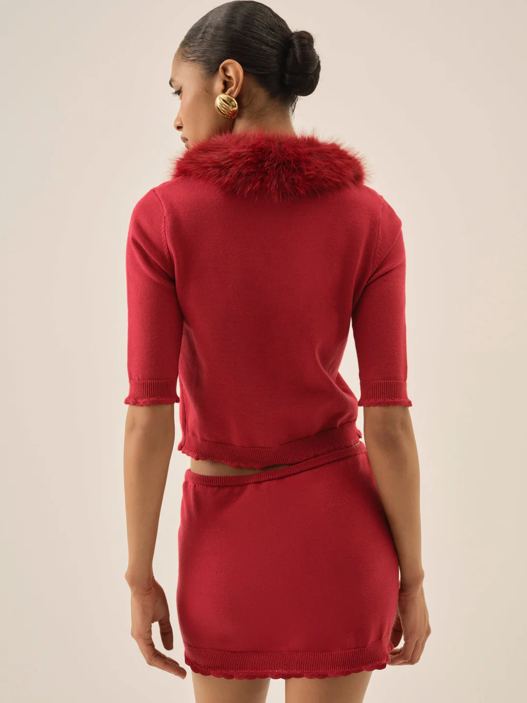 Get festive for the winter season in the Maura red cardigan—featuring a plush fur-like collar. This fitted cardigan is crafted in a soft jersey with three-quarter length sleeves and scalloped rib knit finishings along the hem and sleeves. Pair it with the red Maura Knit Skirt (sold separately) for the complete co-Ord skirt set and perfect holiday party outfit.