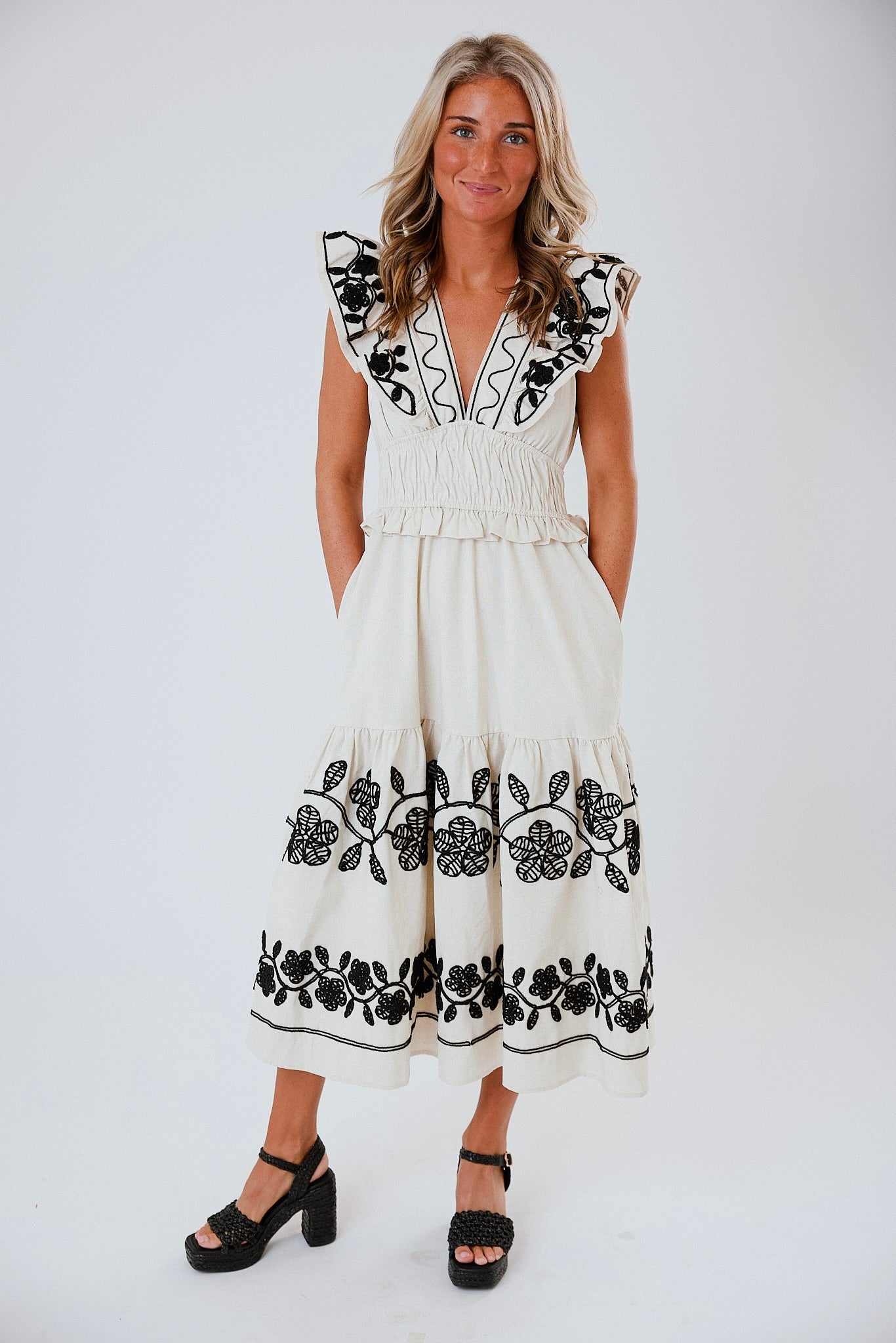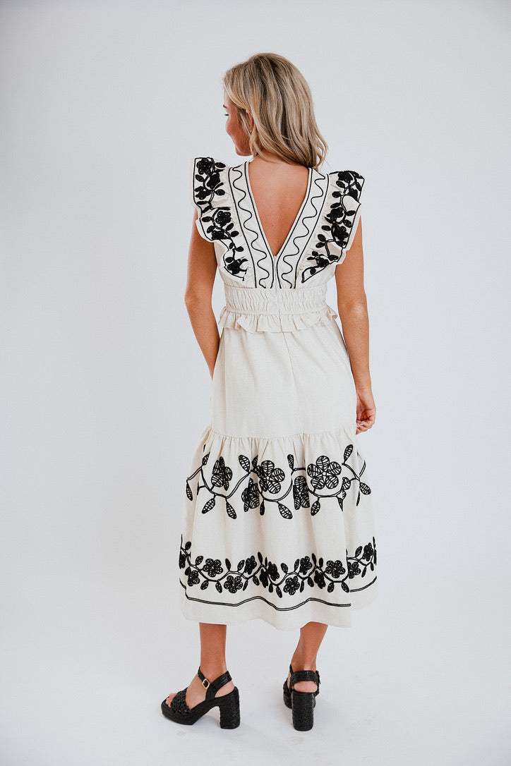 The delicate embroidery details and ruffle trim add a touch of elegance to this beautiful linen dress!