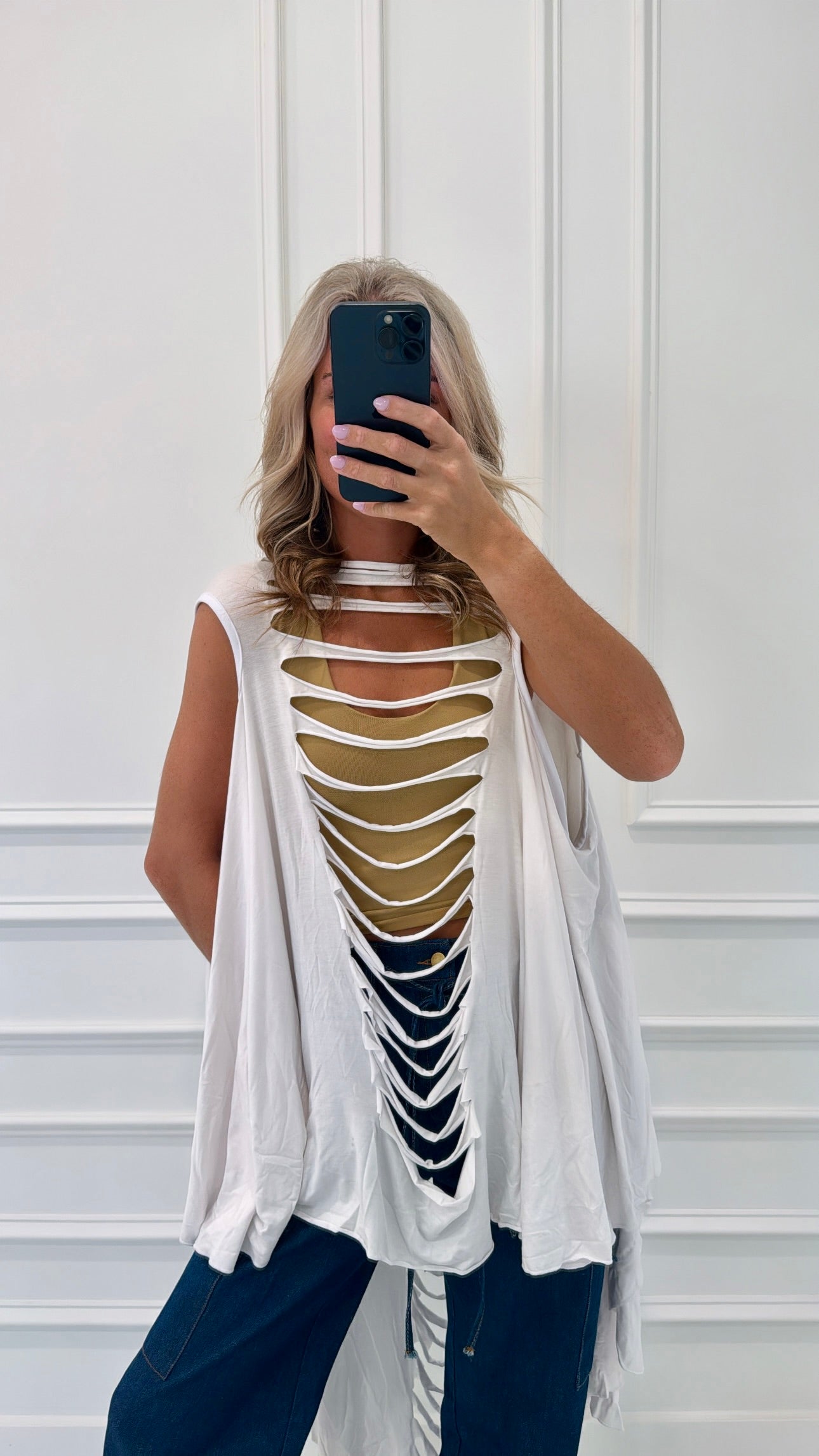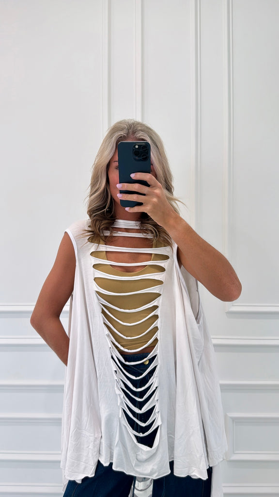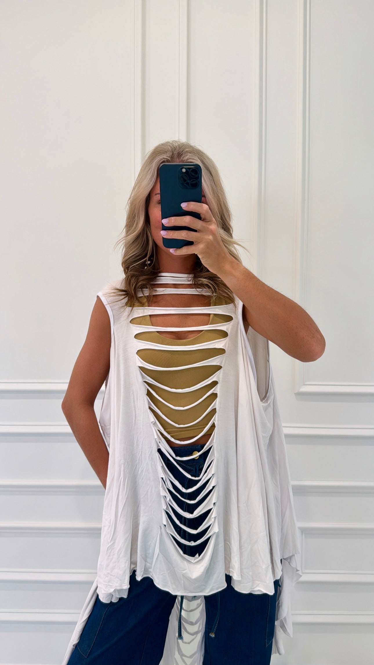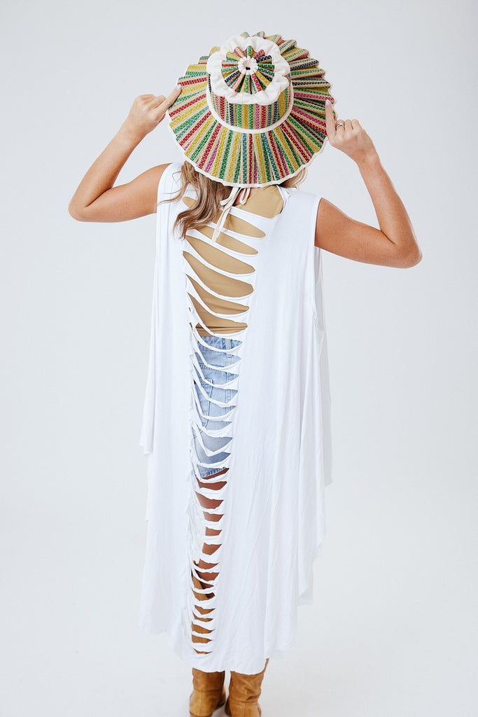 The number of ways you can wear this shawl are endless! There are 10+ ways to style this item. We styled it our favorite way but you can get creative and wear it whichever way strikes your fancy. They are one size fits most for an easy fit! To wear it different lengths simply put your arms through the arm holes and place your head through a distressed area at your desired length.