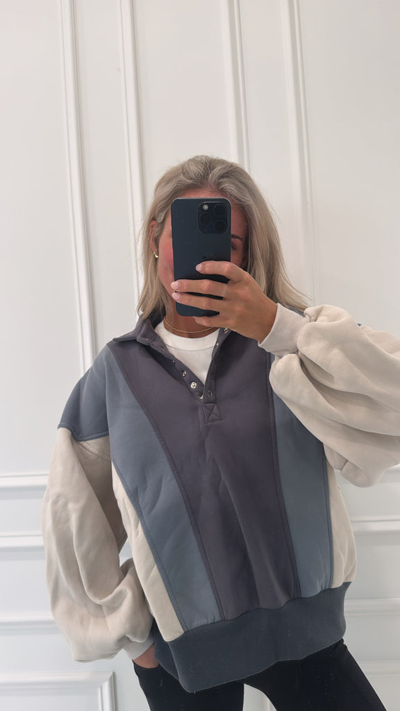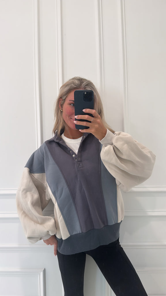 Introducing your new favorite sweatshirt - The Piper Snap Sweatshirt! This oversized washed colorblock sweatshirt is perfect for those days when you want to be comfortable but still make a statement!