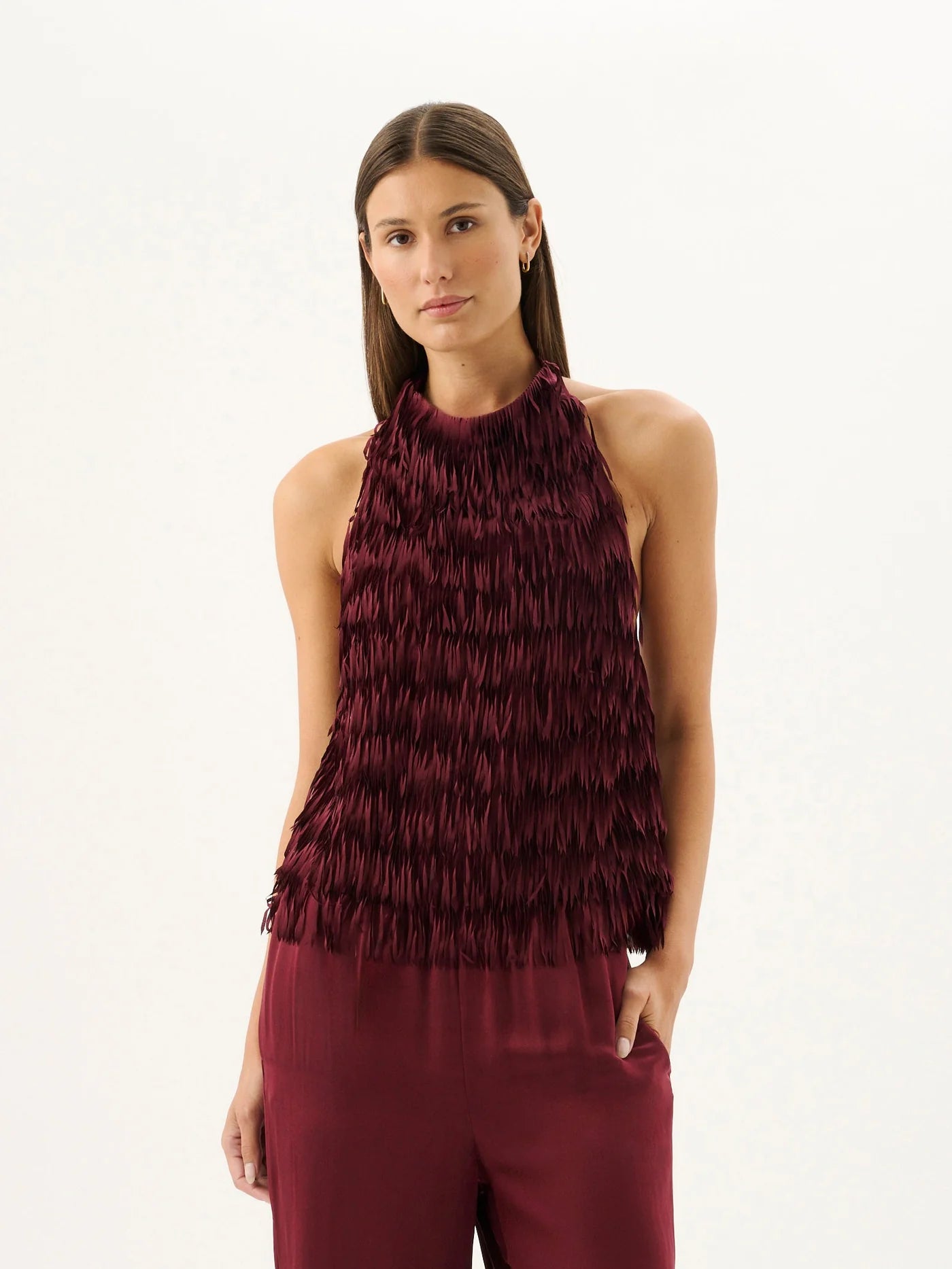 The Sicilia Fringed Top in Sangria is designed with a high cowl neckline and fixed halter for a sleek, modern fit. Cut in a fringed fabrication with a relaxed silhouette that finishes at the waist, this statement piece pairs seamlessly with the Petalo Fringe Pant for a coordinated look.