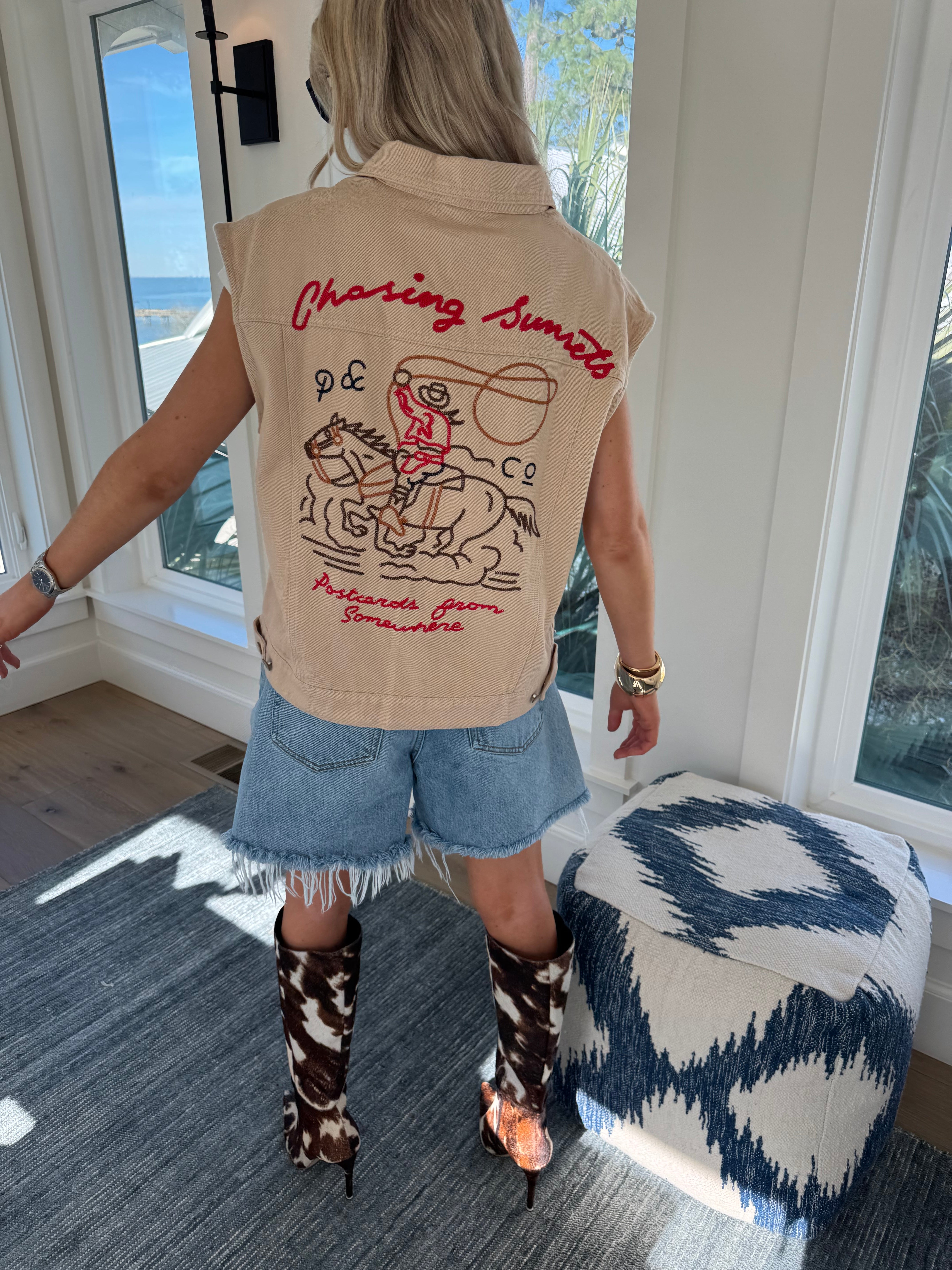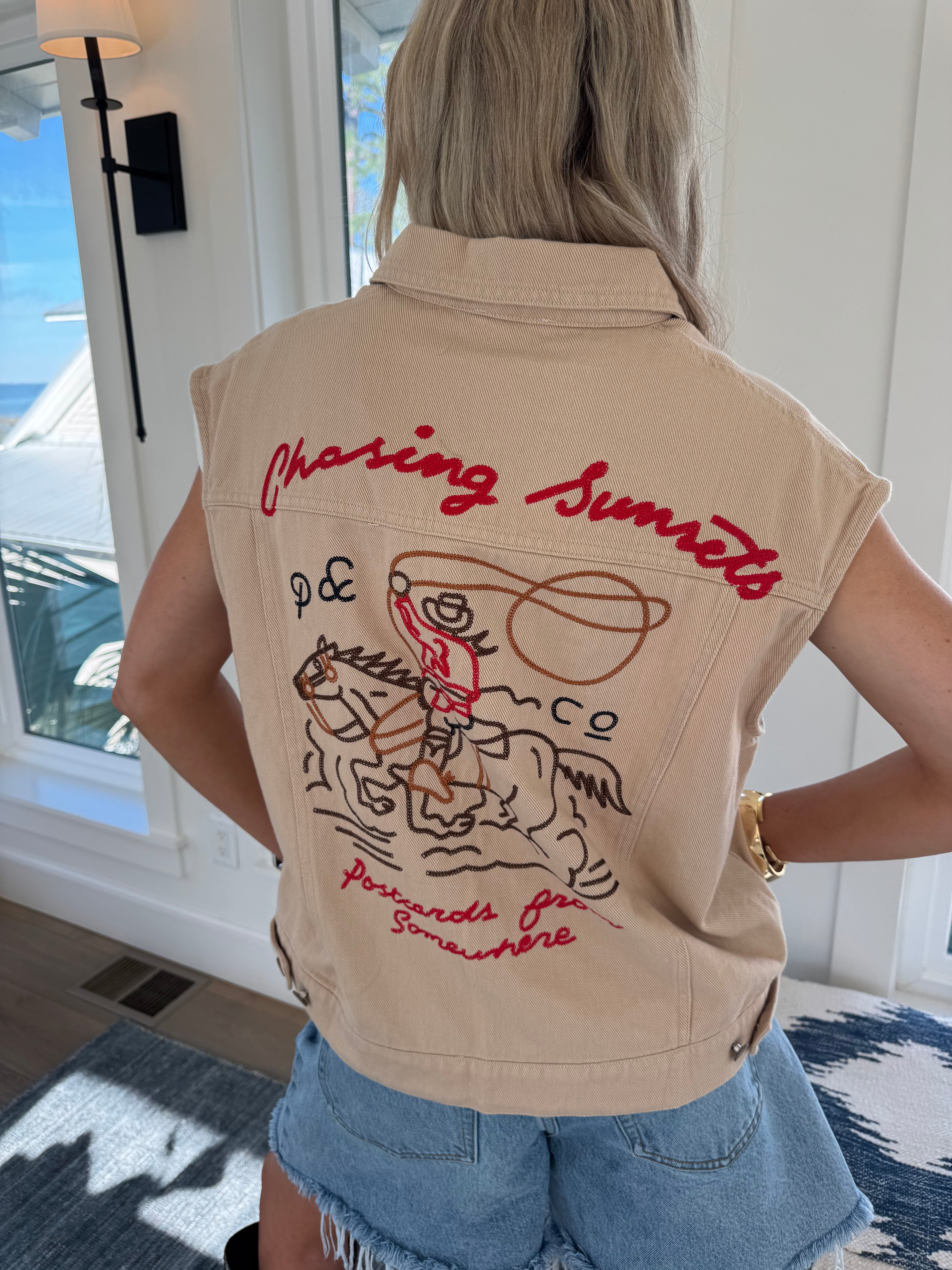 Western Sunset Embroidered Denim Vest - Oatmeal