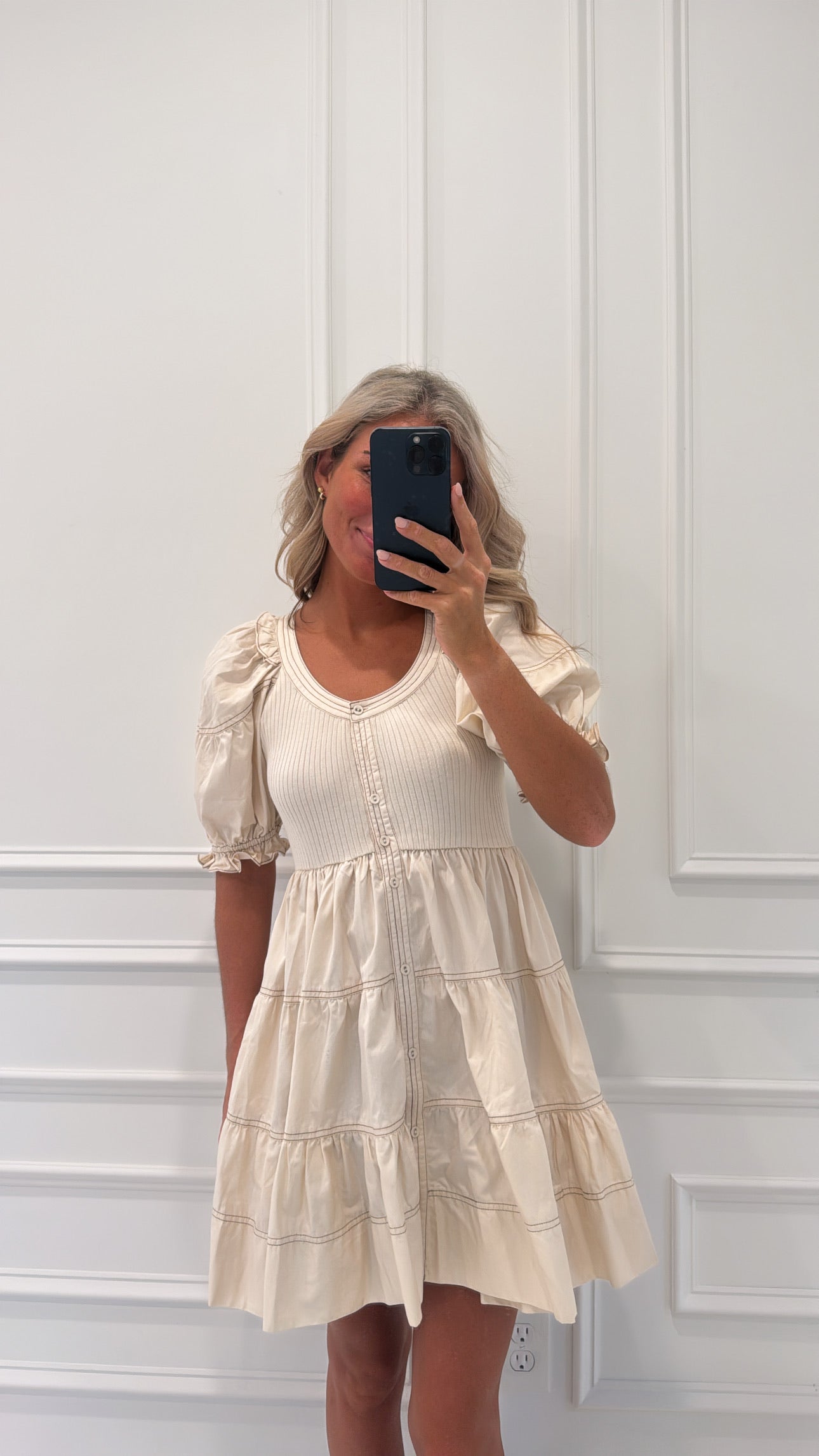 This playful and fun puff-sleeve dress will have you feeling confident and stylish at any event. Its flattering cut and stylish design make it the perfect addition to your wardrobe!