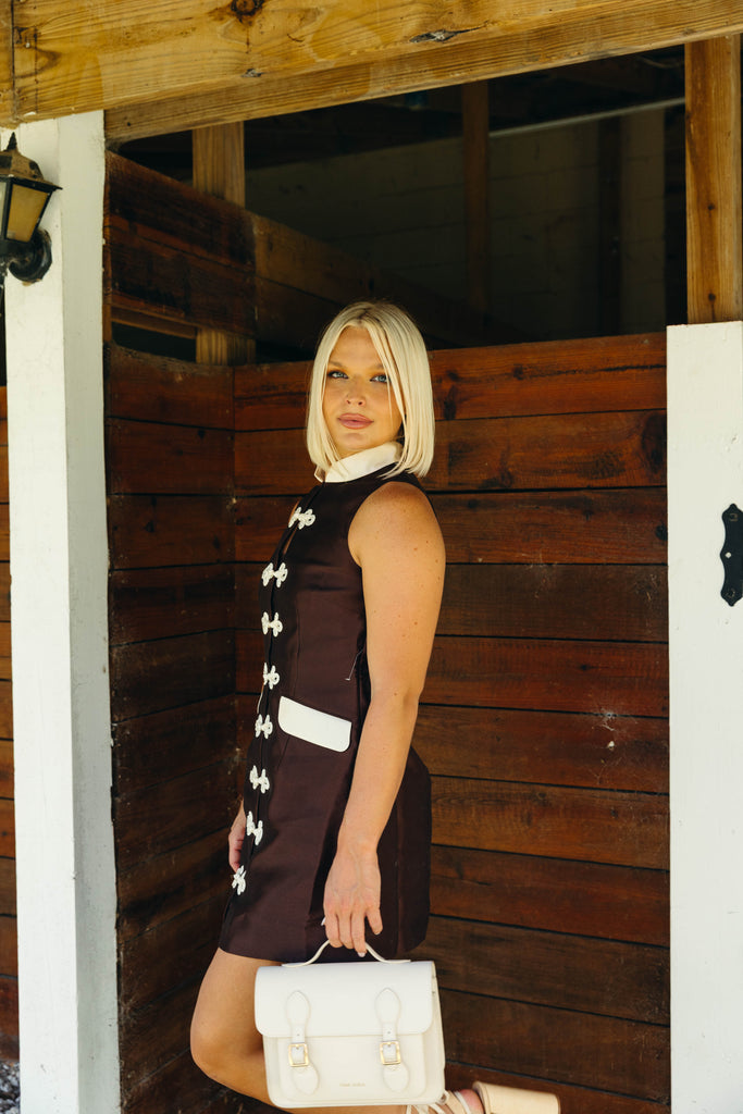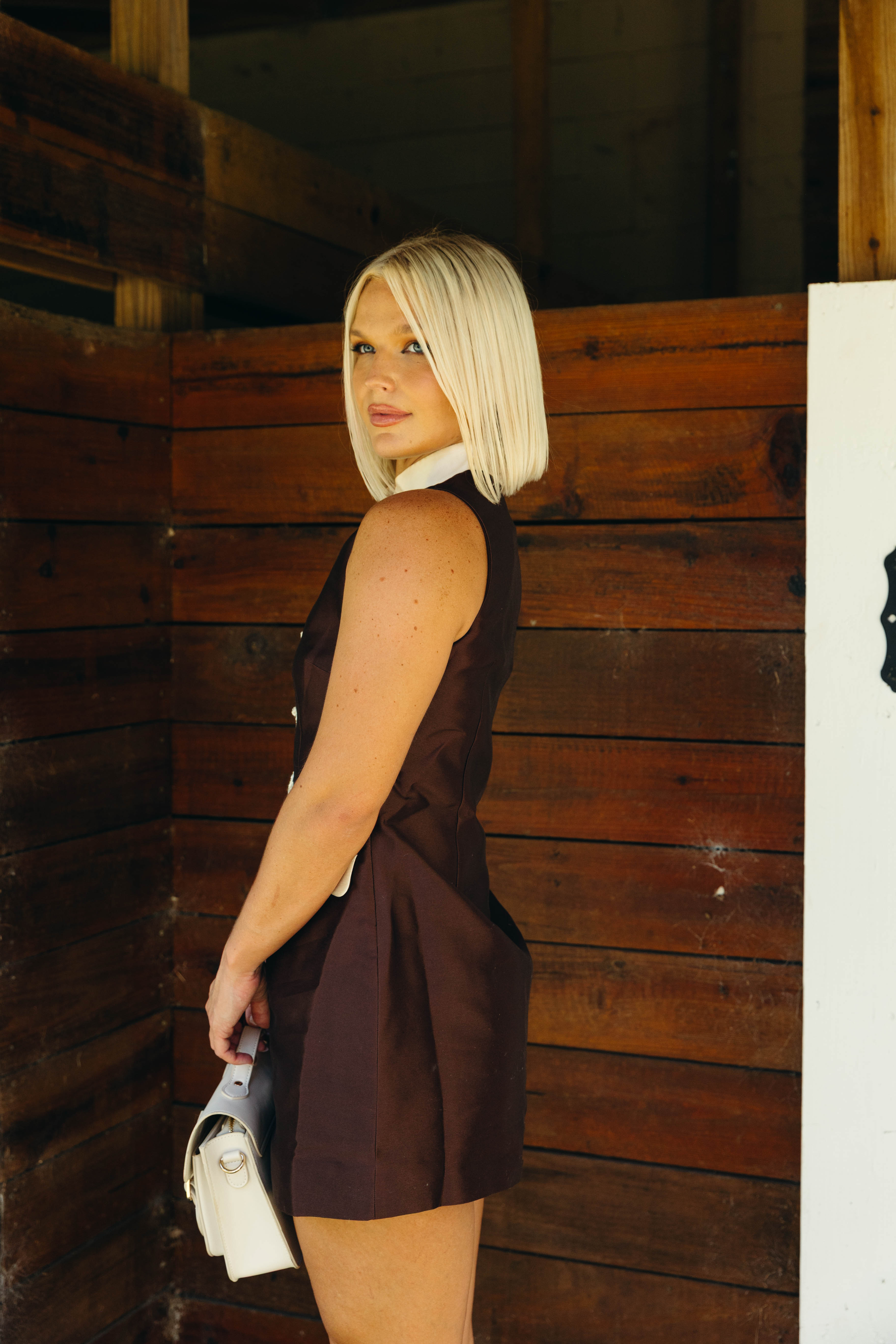 - Fitted silhouette with self-tie detail at back for adjustable shape